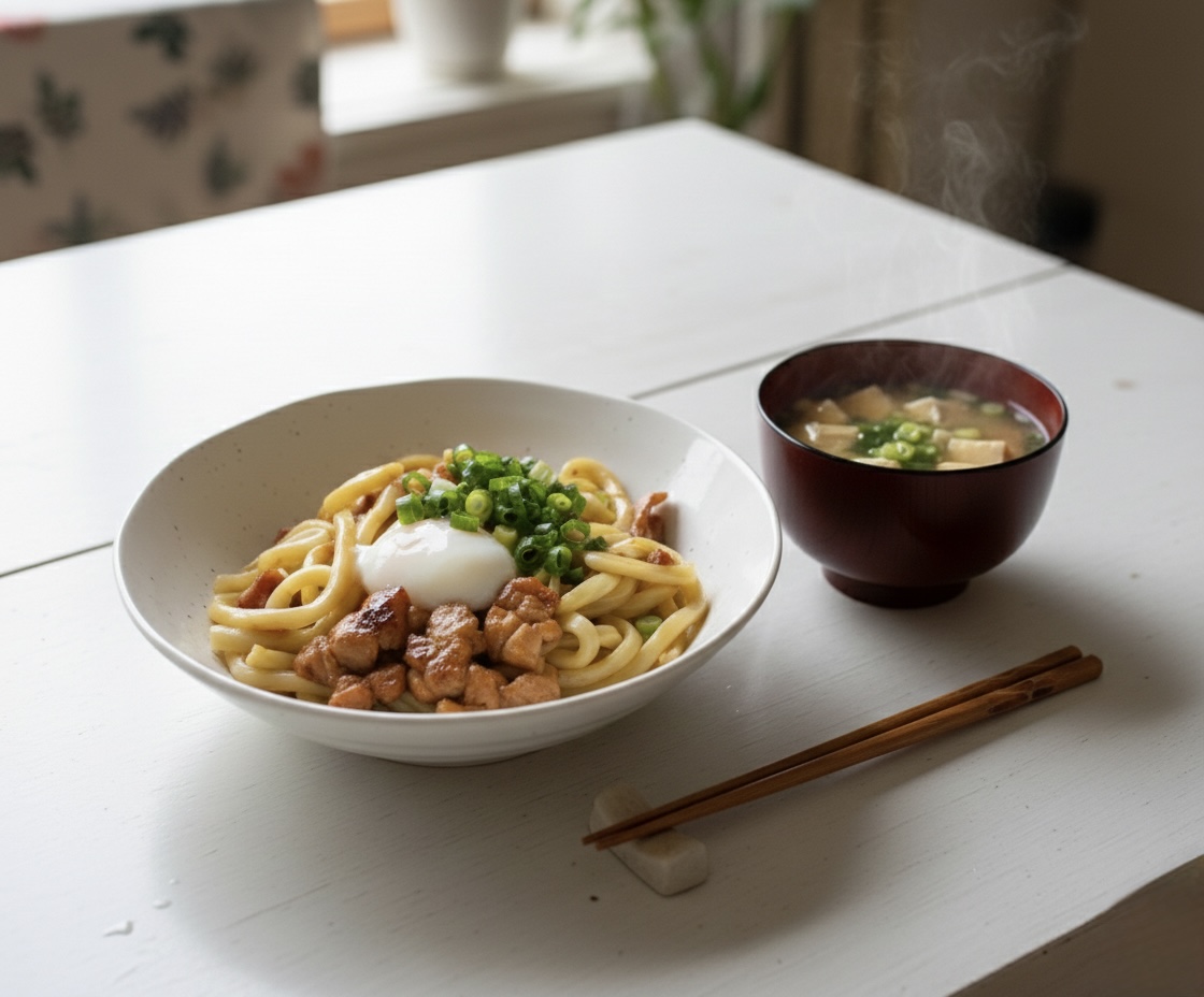 【焼き鳥缶で一発味付け!親子焼きうどん】時短で完成する爆速レシピ